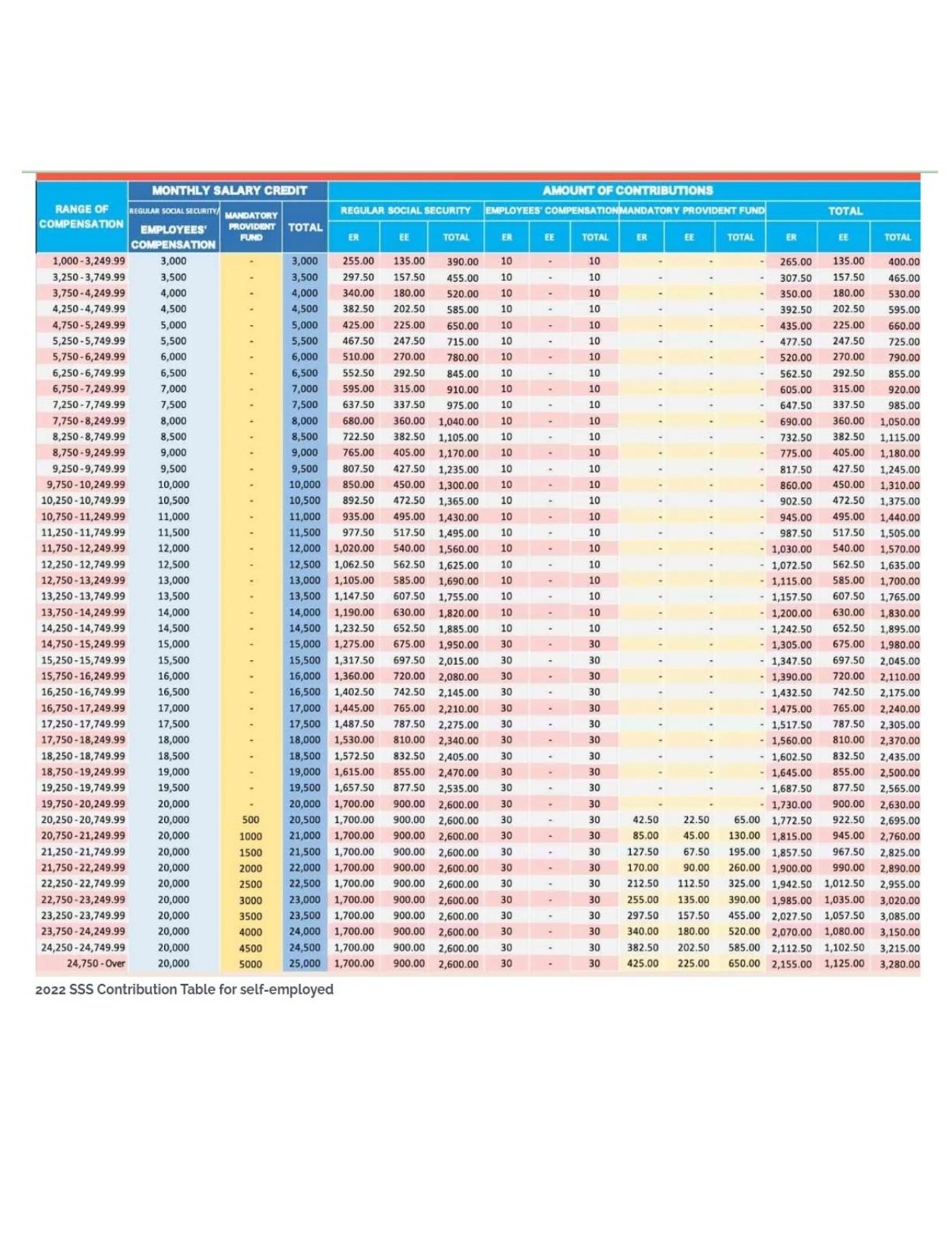 The document is the 2022 SSS Contribution Table, designed for self-employed individuals in the Philippines. It provides a comprehensive breakdown of monthly salary credits and corresponding contribution amounts for the Social Security System (SSS). The table includes various salary ranges, detailing the required contributions for regular social security and additional benefits. This resource is essential for self-employed individuals to ensure compliance with SSS regulations and to understand their contribution obligations. The document is structured in a clear tabular format, making it easy to reference specific salary brackets and contributions. It serves as a vital guide for financial planning and social security benefits.