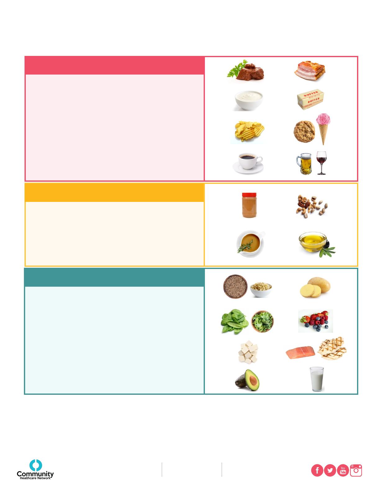 - Includes a chart categorizing foods to avoid and foods to include in the diet.