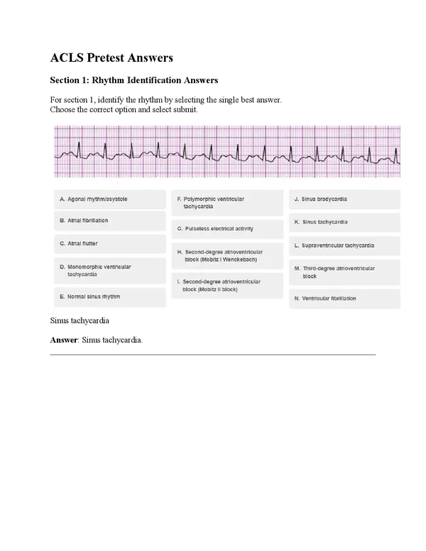 Learn about second-degree atrioventricular block (Mobitz II block) and the need for treatment in bradycardia situations. Discover answers to ACLS pretest questions and understand third-degree atrioventricular block. Explore interventions for sinus tachycardia, pulseless ventricular tachycardia, and polymorphic ventricular tachycardia. Enhance your knowledge of cardiac rhythms and emergency responses with this comprehensive guide.