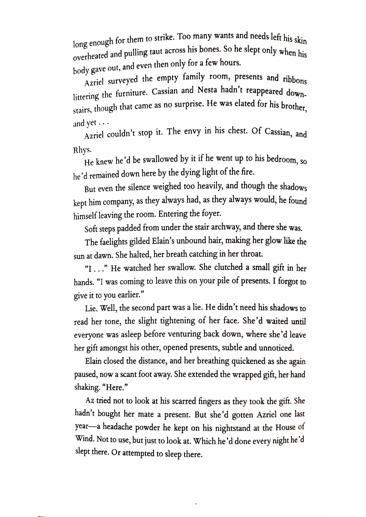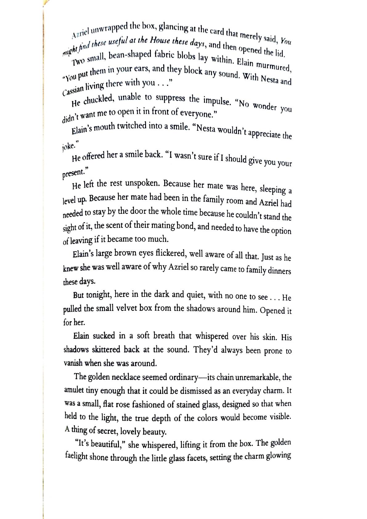 The document describes a quiet moment between Azriel and Elain after a party. Azriel gives Elain a necklace as a gift. They share an intimate moment where Azriel helps Elain put on the necklace and his touch lingers on her neck, arousing them both. Elain considers staying but decides to leave as things have gone too far.