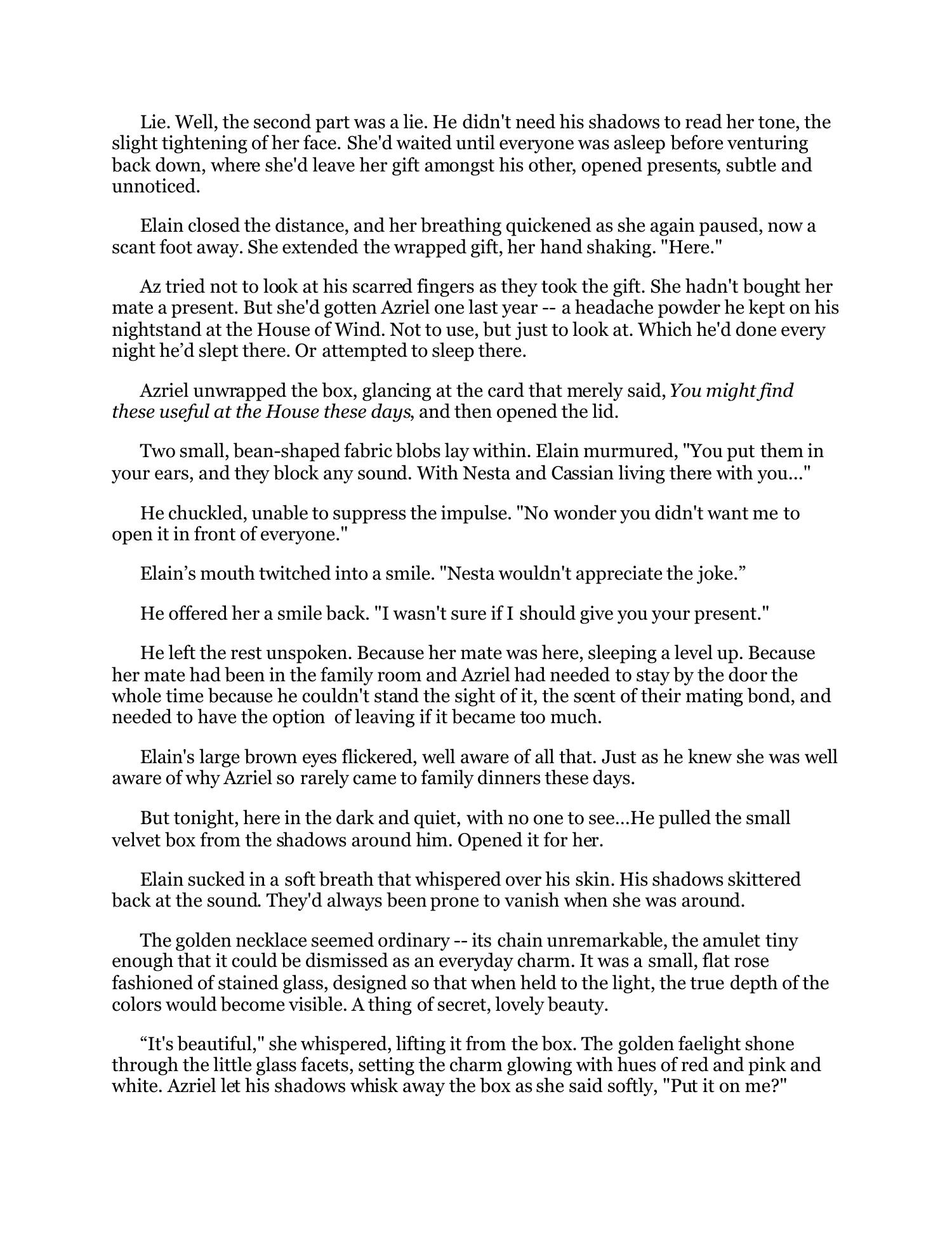 This summary provides context about the document without including any direct quotes. The document is about Azriel from the A Court of Silver Flames book series. It describes a scene where Azriel and Elain exchange gifts alone together late at night. Their interaction becomes intimate until Rhys interrupts them. Rhys confronts Azriel about his actions, questioning if he has lost his mind. Azriel argues that the Cauldron may have been wrong and that Lucien is not a worthy mate for Elain.