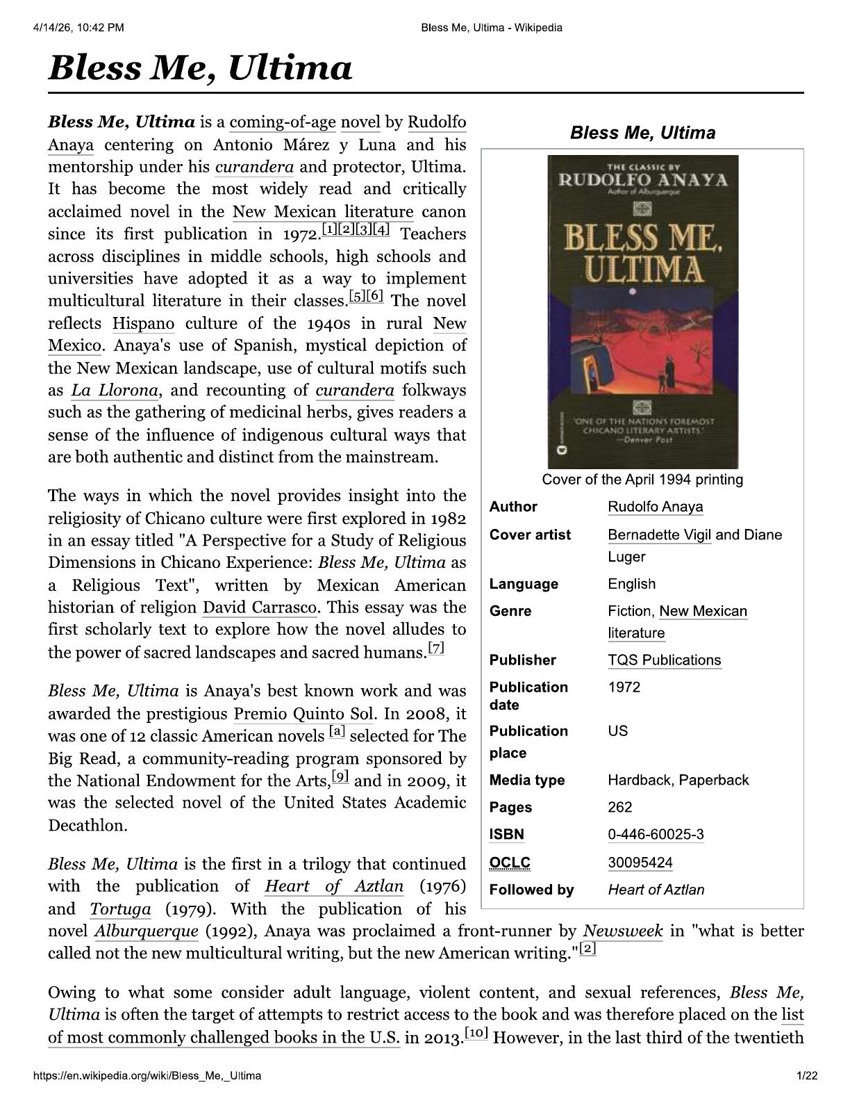 Bless Me Ultima by Rudolfo Anaya is a coming-of-age novel about Antonio Márez, a young boy in 1940s New Mexico navigating cultural identity, faith, and good vs. evil under the guidance of Ultima, a mystical curandera (healer). Antonio struggles between his parents’ opposing dreams for him—becoming a farmer or a vaquero—and explores indigenous spirituality (the golden carp) alongside Catholicism. The novel follows his journey as he witnesses violent deaths and learns to forge his own identity.