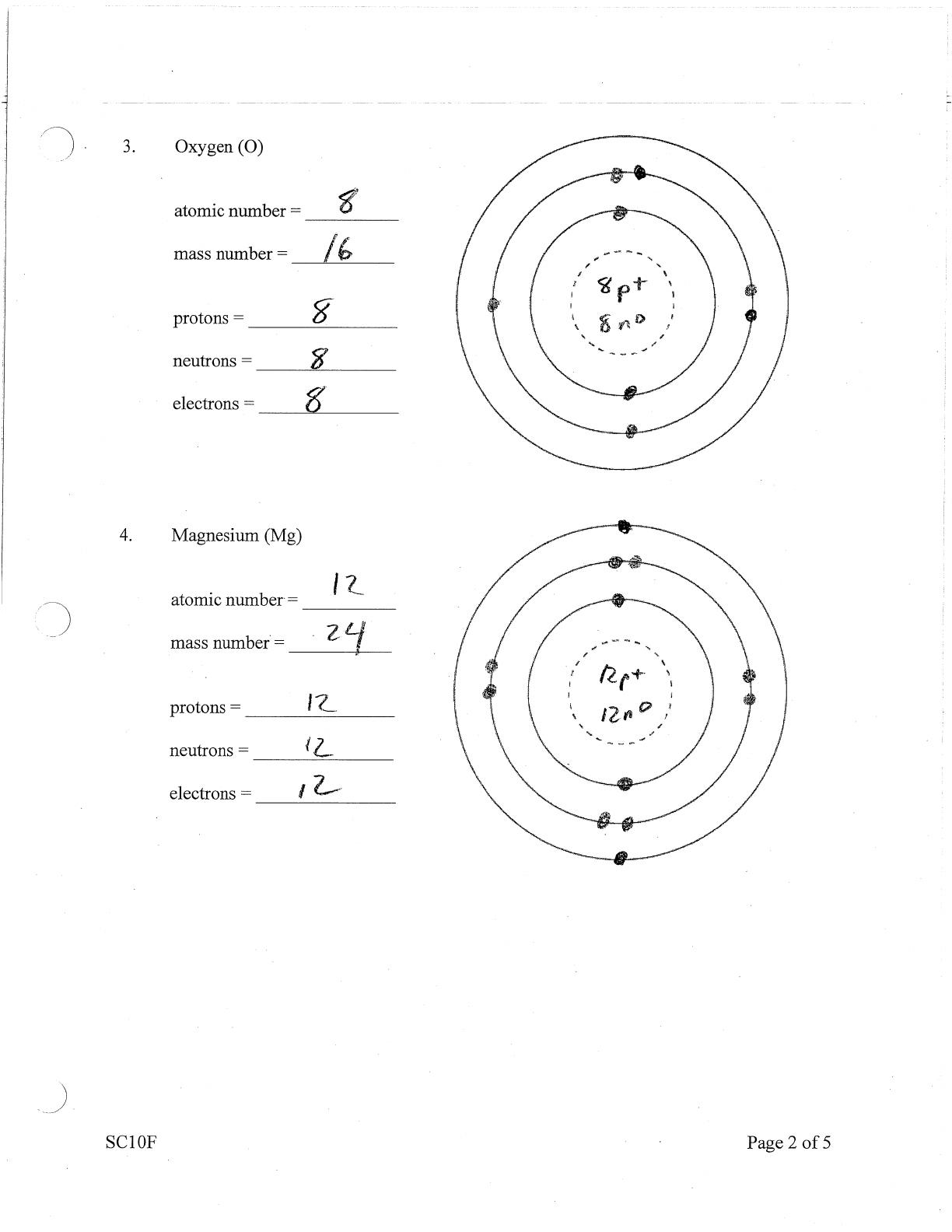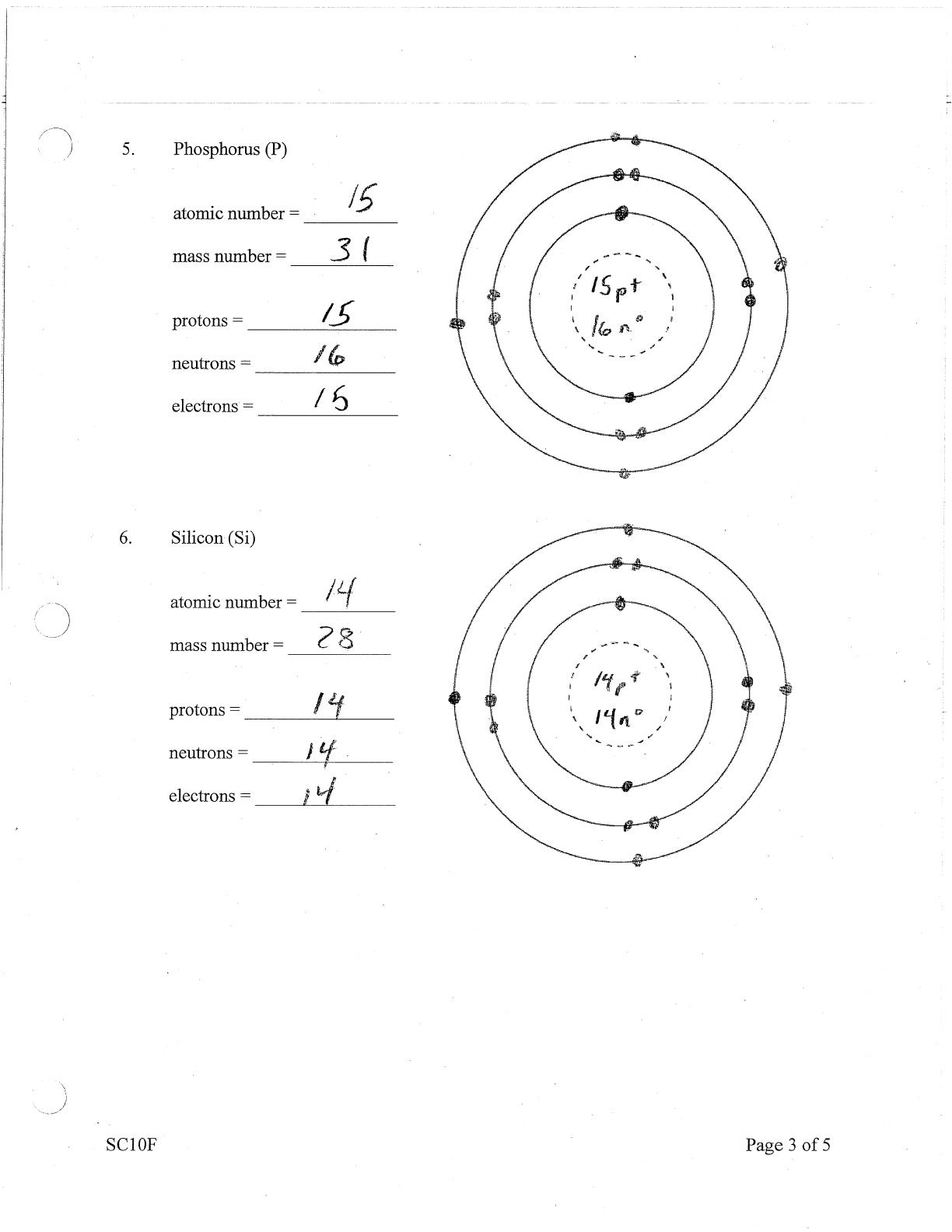 This document contains answers to a worksheet focused on Bohr diagrams, which are essential for understanding atomic structure in chemistry. It includes detailed answers for various elements such as Carbon, Beryllium, Oxygen, Magnesium, Phosphorus, Silicon, Neon, Aluminum, Argon, and Chlorine. Each section provides the atomic number, mass number, number of protons, neutrons, and electrons, along with a corresponding Bohr diagram illustrating the electron arrangement. This educational resource is designed for students studying chemistry, helping them visualize and comprehend the atomic model. The worksheet format allows for easy use in classroom settings or for individual study. Overall, it serves as a valuable tool for reinforcing concepts related to atomic structure and electron configuration.