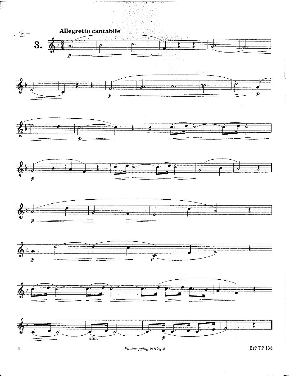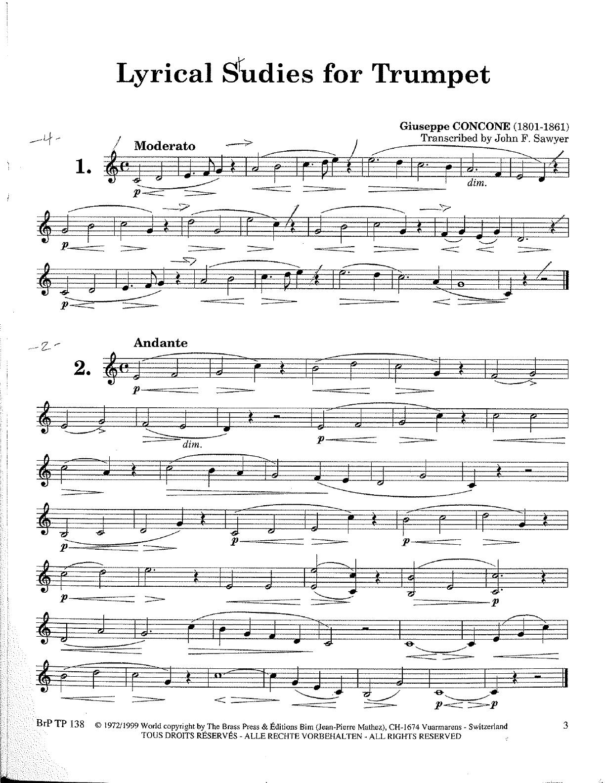 This document is a collection of lyrical studies for trumpet, composed by Giuseppe Concone (1801-1861). Transcribed by John F. Sawyer, it serves as a valuable resource for trumpet players seeking to enhance their lyrical playing skills. The studies are structured in various tempos and styles, including moderato, andante, and allegretto, allowing musicians to explore a range of expressive techniques. The document spans 35 pages and includes detailed musical notations and dynamics, making it suitable for both students and advanced players. Published by The Brass Press, this PDF edition provides easy access to essential exercises that focus on tone production, phrasing, and musicality. Overall, it is an important tool for trumpet education and performance.