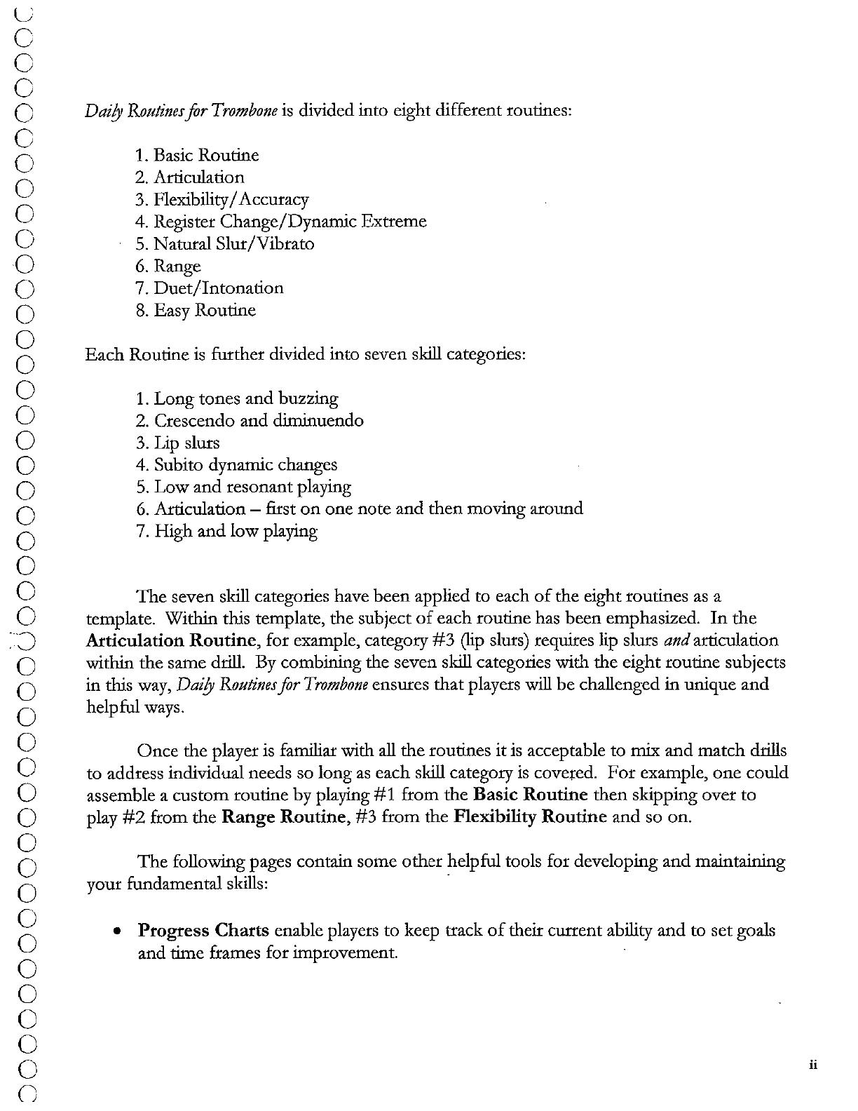 This document, titled ‘David Vining Daily Routines For Trombone’, serves as a comprehensive practice guide for trombone players. Authored by David Vining, it focuses on essential daily routines that help musicians develop their technical skills and improve their overall performance. The guide is structured into various sections, addressing key topics such as articulation, high range, low range, and lip slurs. Each section includes exercises designed to enhance specific skills, making it suitable for both beginner and advanced players. Additionally, the document features progress charts that allow players to track their development over time. This resource is ideal for trombone students, educators, and anyone looking to refine their playing techniques. Overall, it is a valuable tool for dedicated musicians aiming to establish a consistent practice routine.