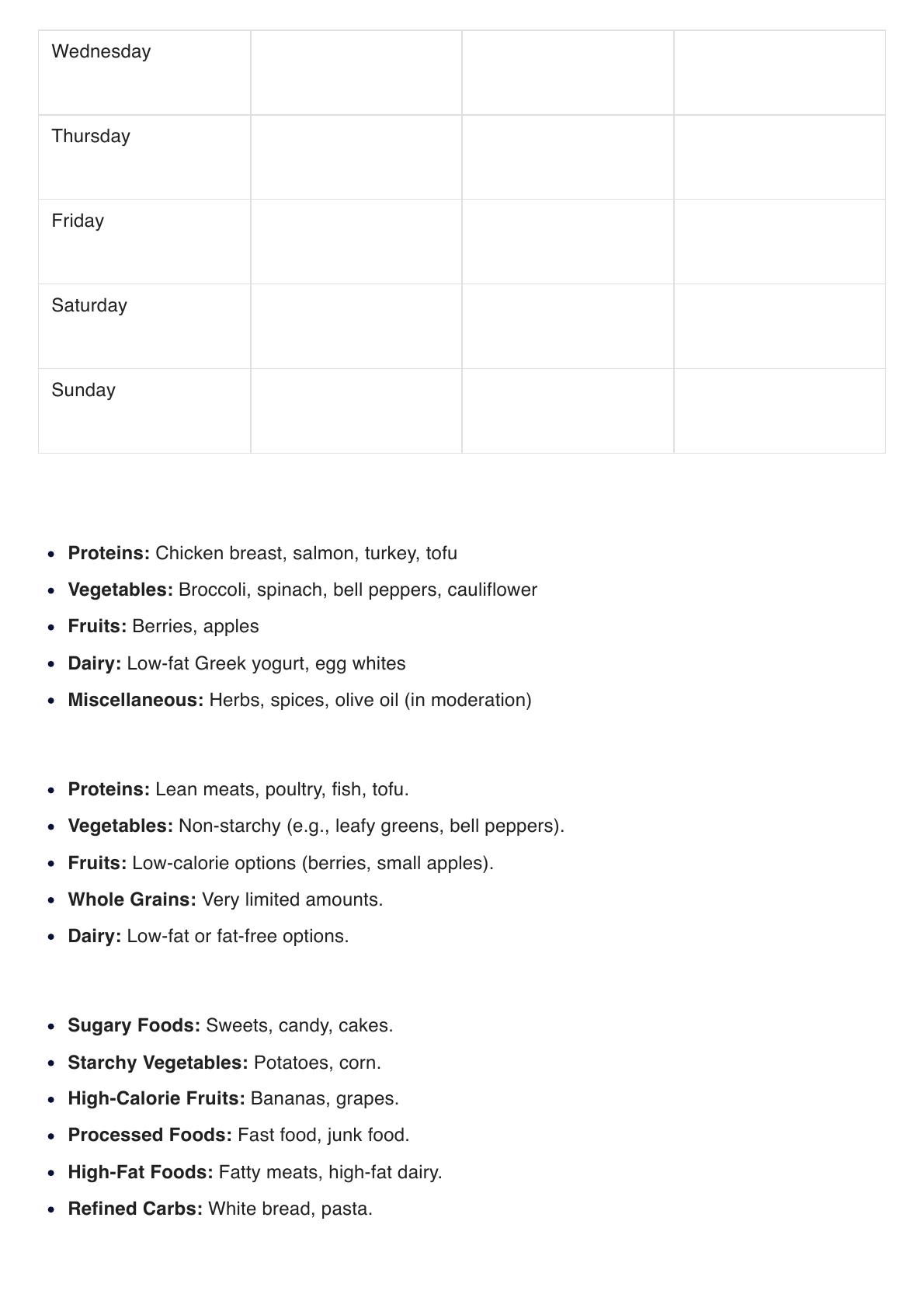 - Includes a structured meal plan with breakfast, lunch, and dinner options focusing on lean proteins and vegetables.