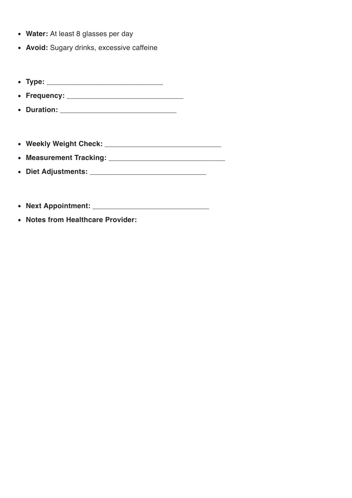 - Offers hydration guidelines recommending at least 8 glasses of water per day while avoiding sugary drinks.