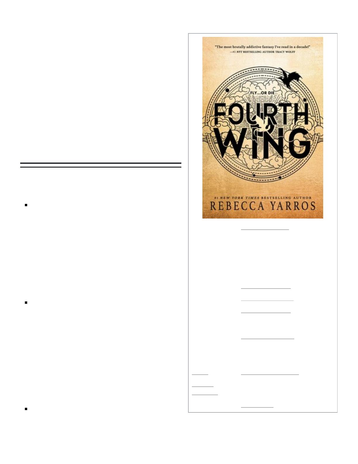 Fourth Wing by Rebecca Yarros is a high-stakes “romantasy” novel following 20-year-old Violet Sorrengail, who is forced by her mother to join the brutal Basgiath War College to become a dragon rider. Set in the kingdom of Navarre, Violet must survive deadly training, hostile cadets, and bond with a dragon.