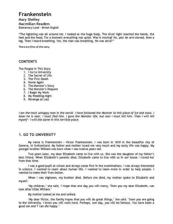 Frankenstein by Mary Shelley, retold by Margaret Tarner for the Macmillan Readers Elementary Level, is a simplified version of the classic Gothic horror story specifically designed for English language learners.