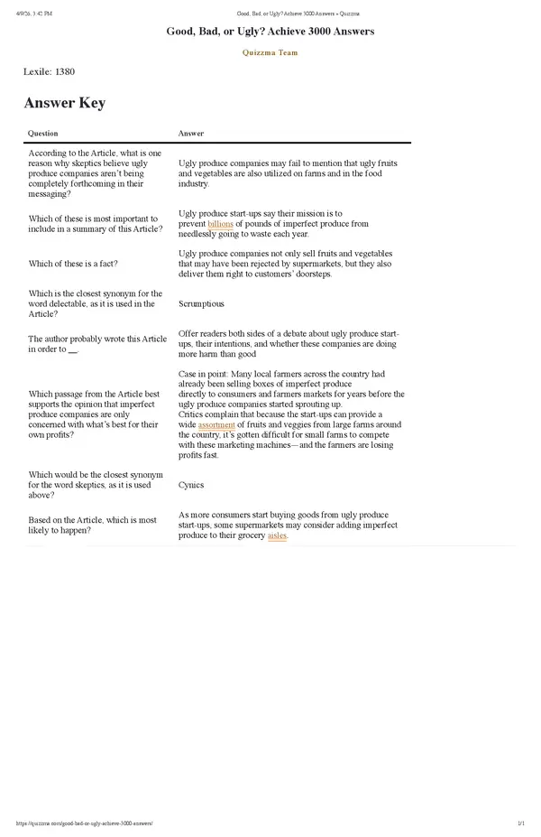 Achieve3000’s “Good, Bad, or Ugly” lesson generally explores the ethical, environmental, and economic aspects of selling imperfect or “ugly” produce to reduce food waste. It focuses on how marketing odd-looking fruits and veggies can combat waste, though some may argue it changes consumer perceptions of food quality.