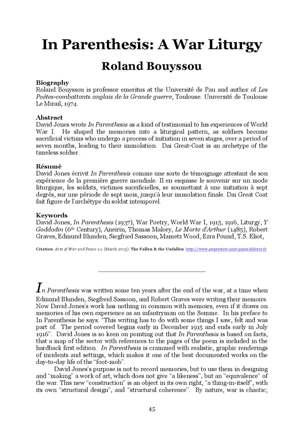 Roland Bouyssou, a professor emeritus at the Université de Pau, interprets David Jones’s modernist masterpiece, In Parenthesis, as a structured “war liturgy” where the battlefield functions as a sacred space of sacrifice.