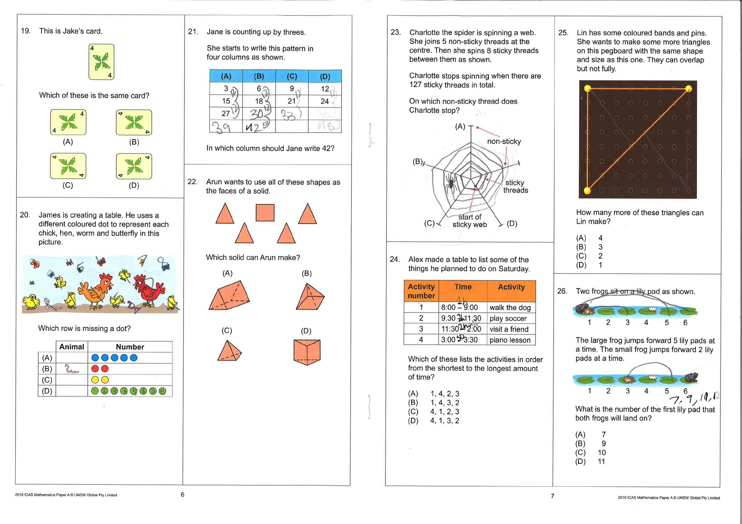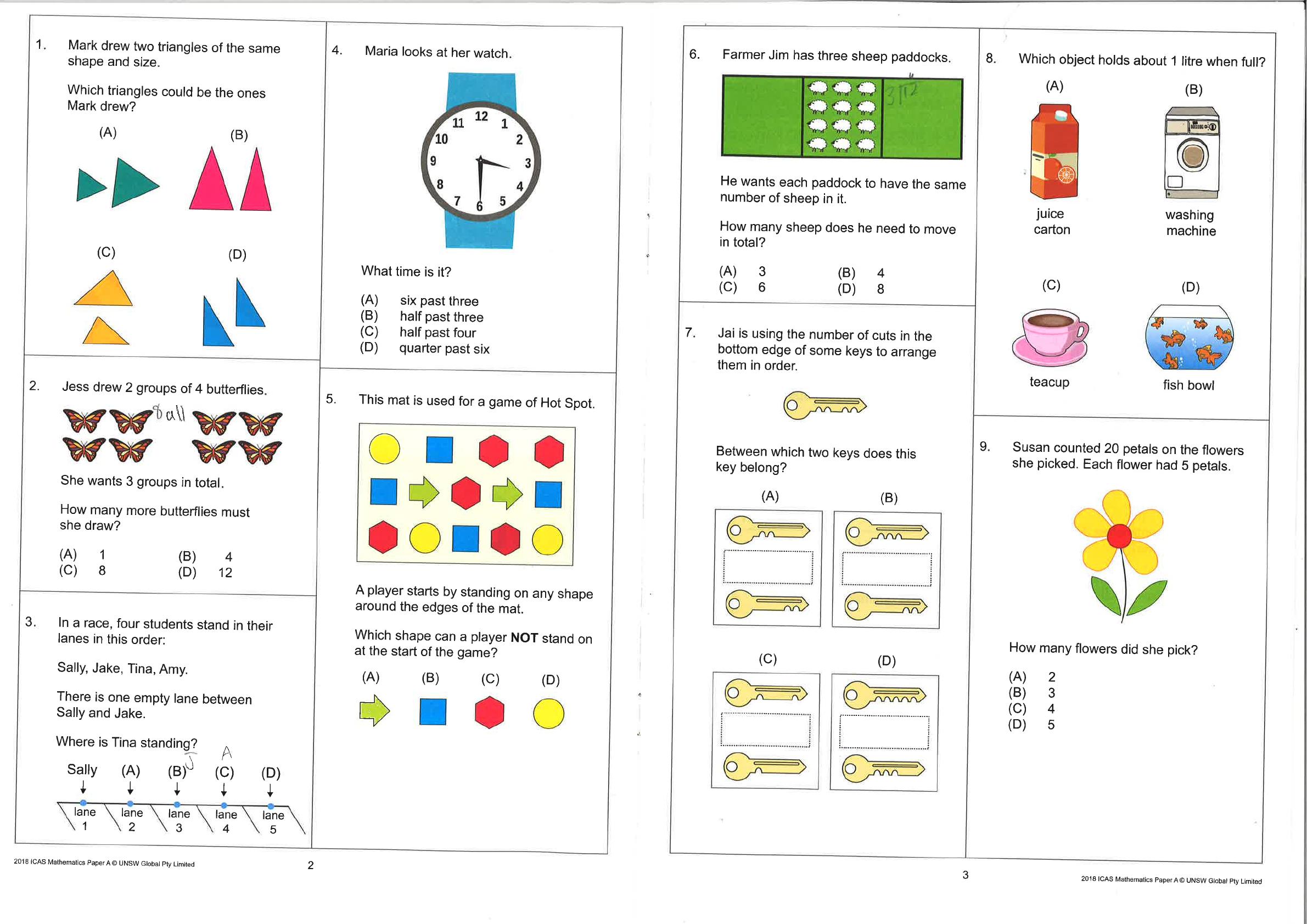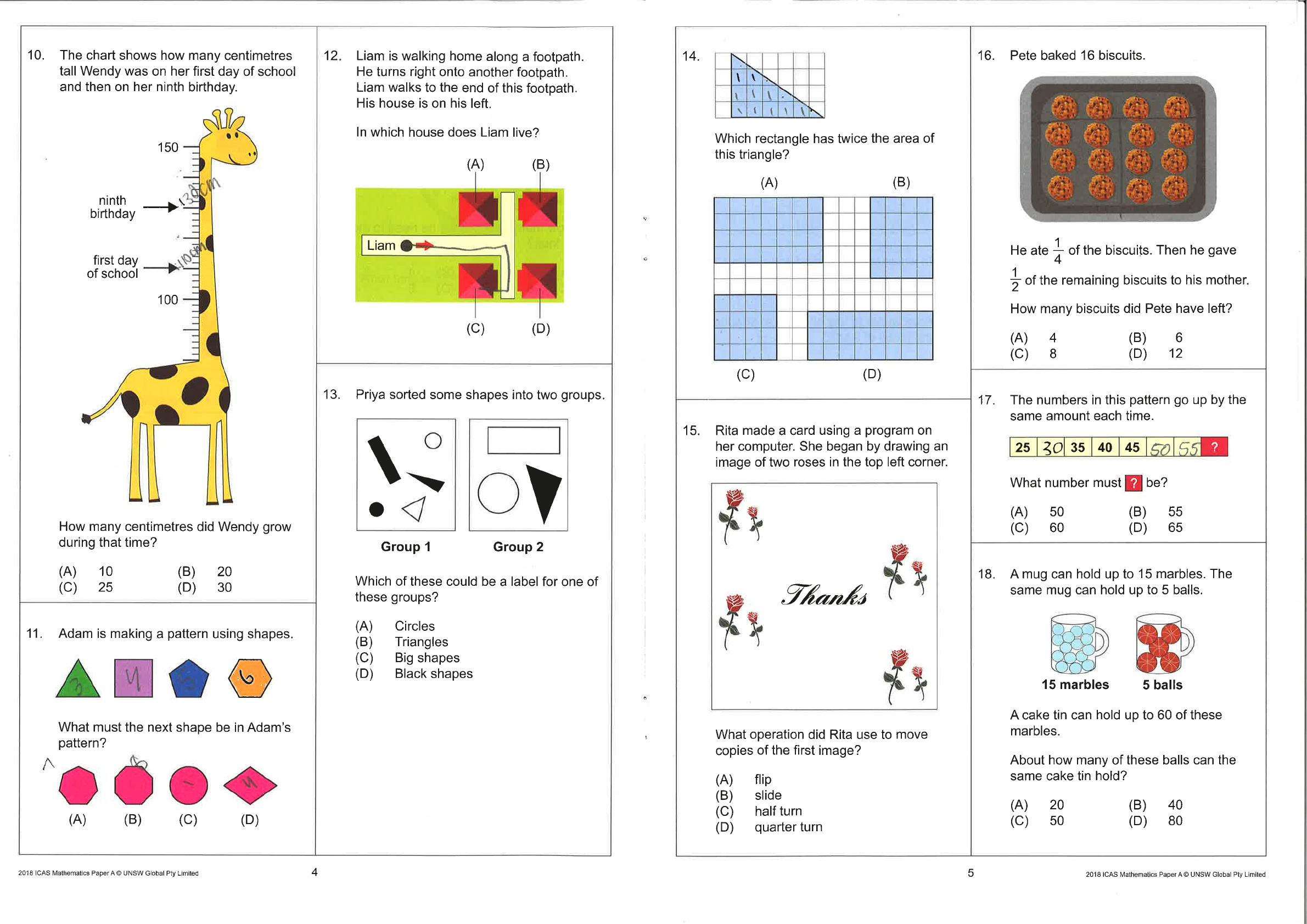 The document is the 2018 Paper A for the ICAS Maths assessment, designed for students to evaluate their mathematical skills. It includes a variety of questions that cover key topics such as geometry, arithmetic, and problem-solving. The paper is structured into multiple sections, featuring both multiple-choice and open-ended questions to assess different levels of understanding. This assessment tool is ideal for educators seeking to measure student performance in mathematics. It is formatted as a PDF for easy distribution and printing. The questions are designed to challenge students and encourage critical thinking, making it a valuable resource for classroom use or individual study.
