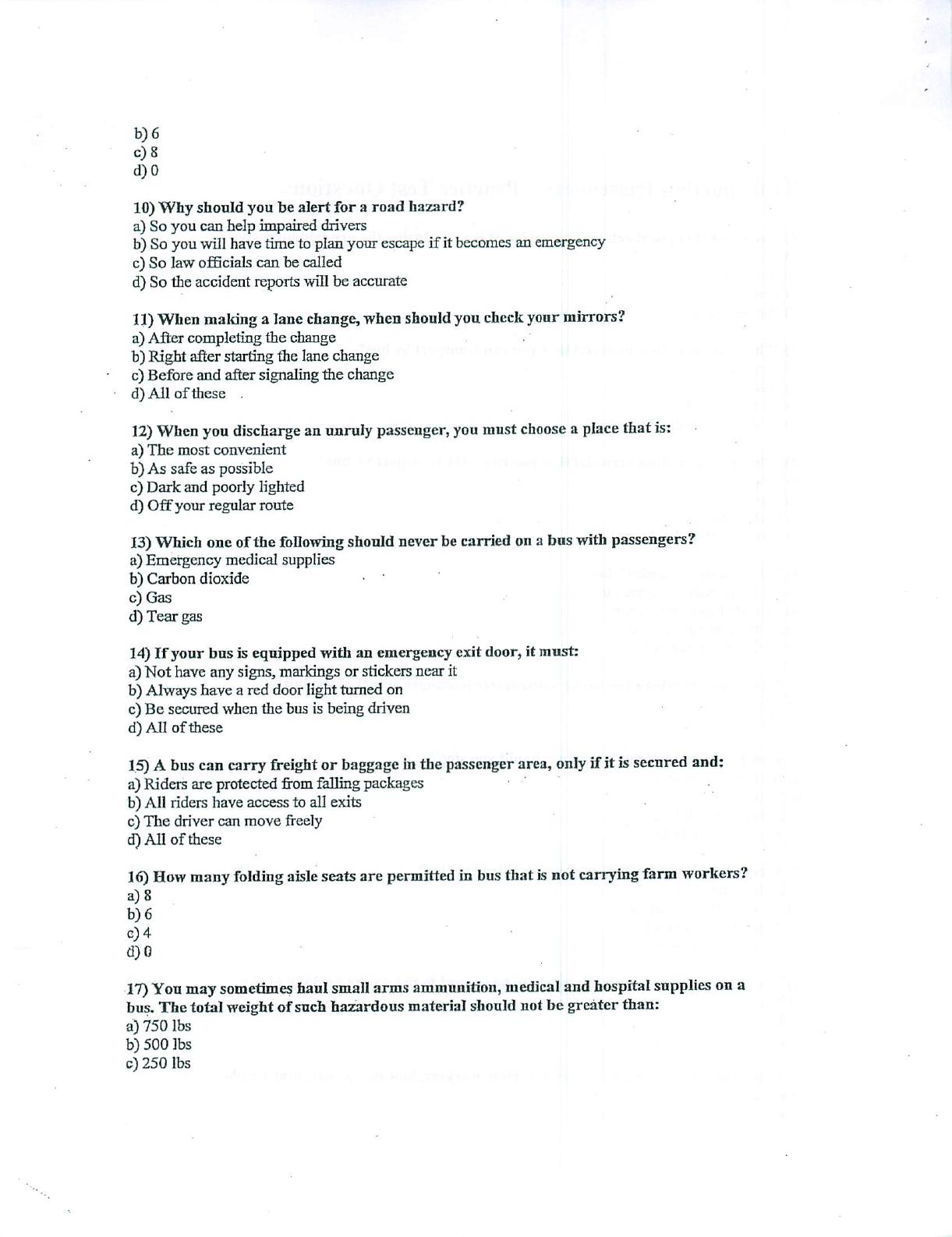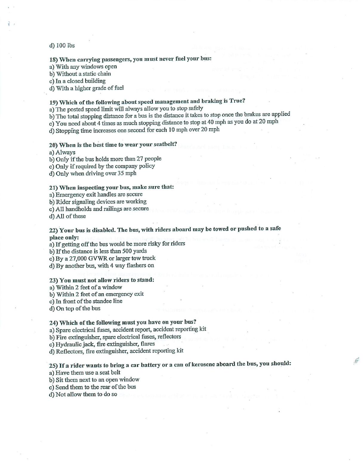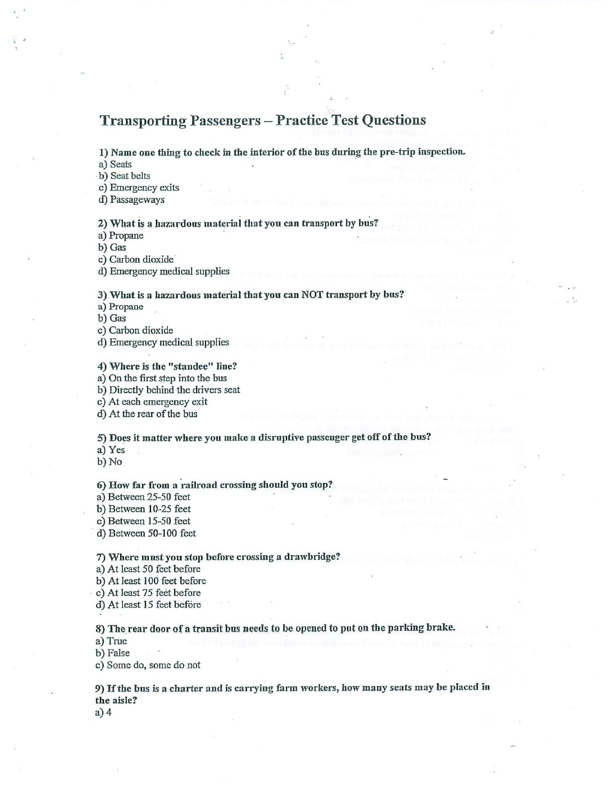 This document is a Transporting Passengers practice test containing 83 multiple-choice and true/false questions with an answer key, designed to help CDL (Commercial Driver’s License) candidates prepare for the passenger endorsement exam by covering topics such as pre-trip inspections, hazardous materials restrictions on buses, standee line rules, railroad and drawbridge crossing procedures, handling disruptive passengers, emergency equipment requirements (fire extinguisher, spare fuses, reflectors), fueling safety with passengers onboard, braking and speed management on curves and hills, tire regulations (no recapped/regrooved tires on front wheels), brake-door interlock systems, aisle seat limits for farm worker charters, loading and unloading safety, bus accident locations (intersections), mirror scanning, hazardous material labels, and commercial license requirements for vehicles seating 16 or more persons including the driver.