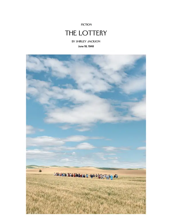 “The Lottery” is a short story by Shirley Jackson that was first published in The New Yorker on June 26, 1948. The story describes a fictional small American community that observes an annual tradition known as “the lottery”, which is intended to ensure a good harvest and purge the town of bad omens.