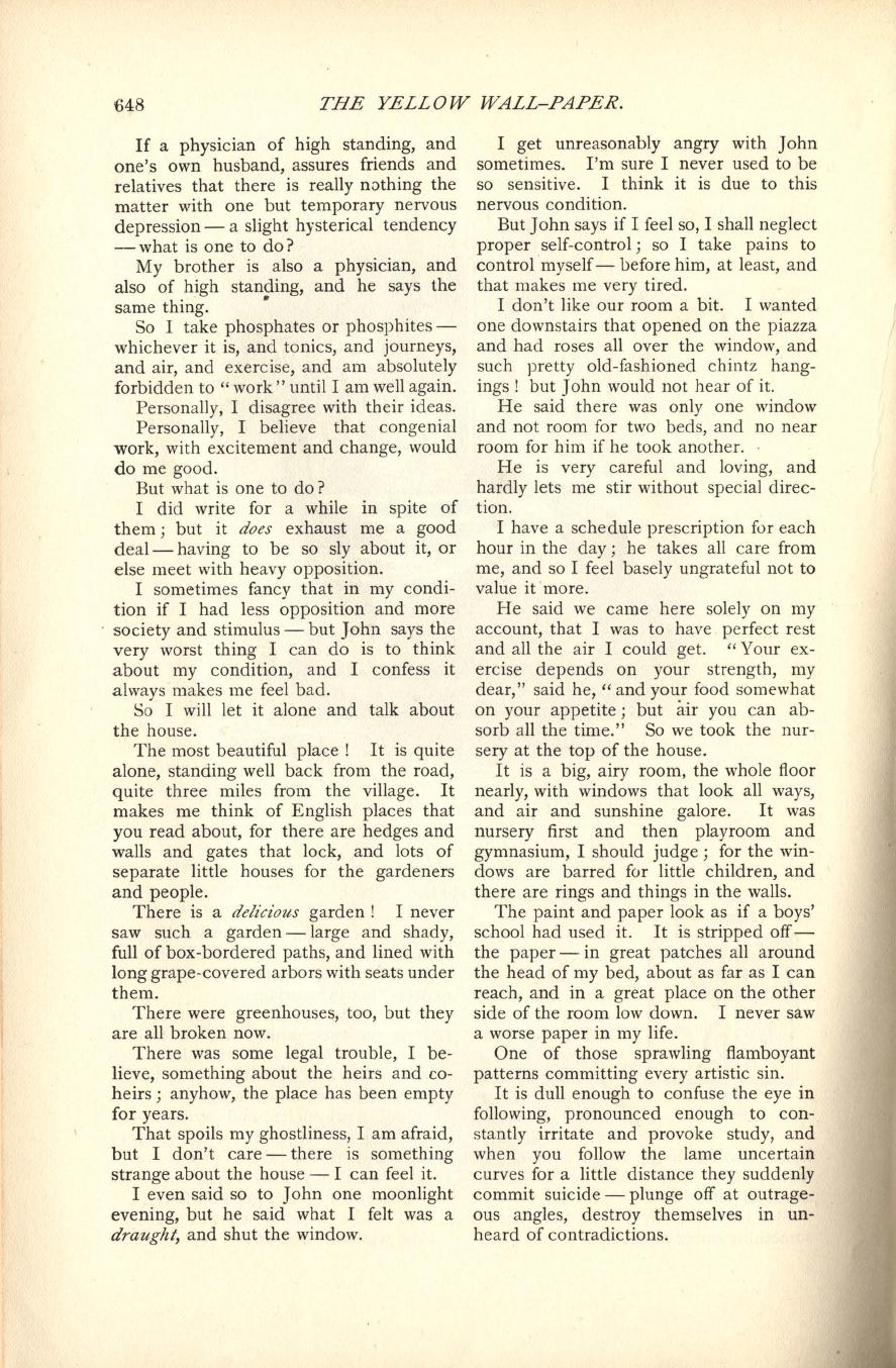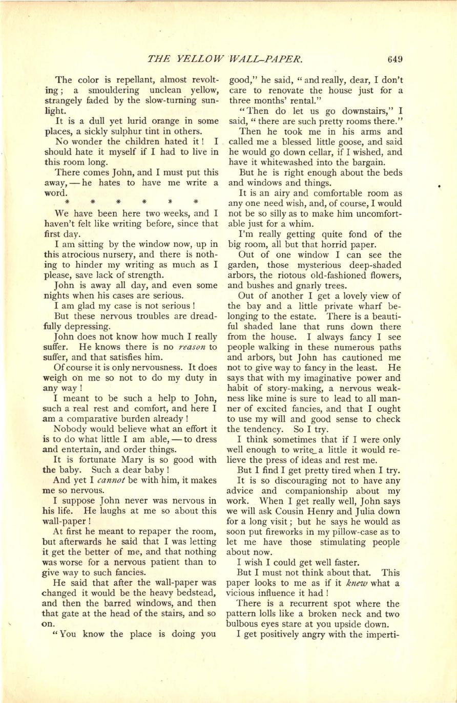 “The Yellow Wallpaper” is a short story by American writer Charlotte Perkins Gilman, first published in January 1891 in The New England Magazine.