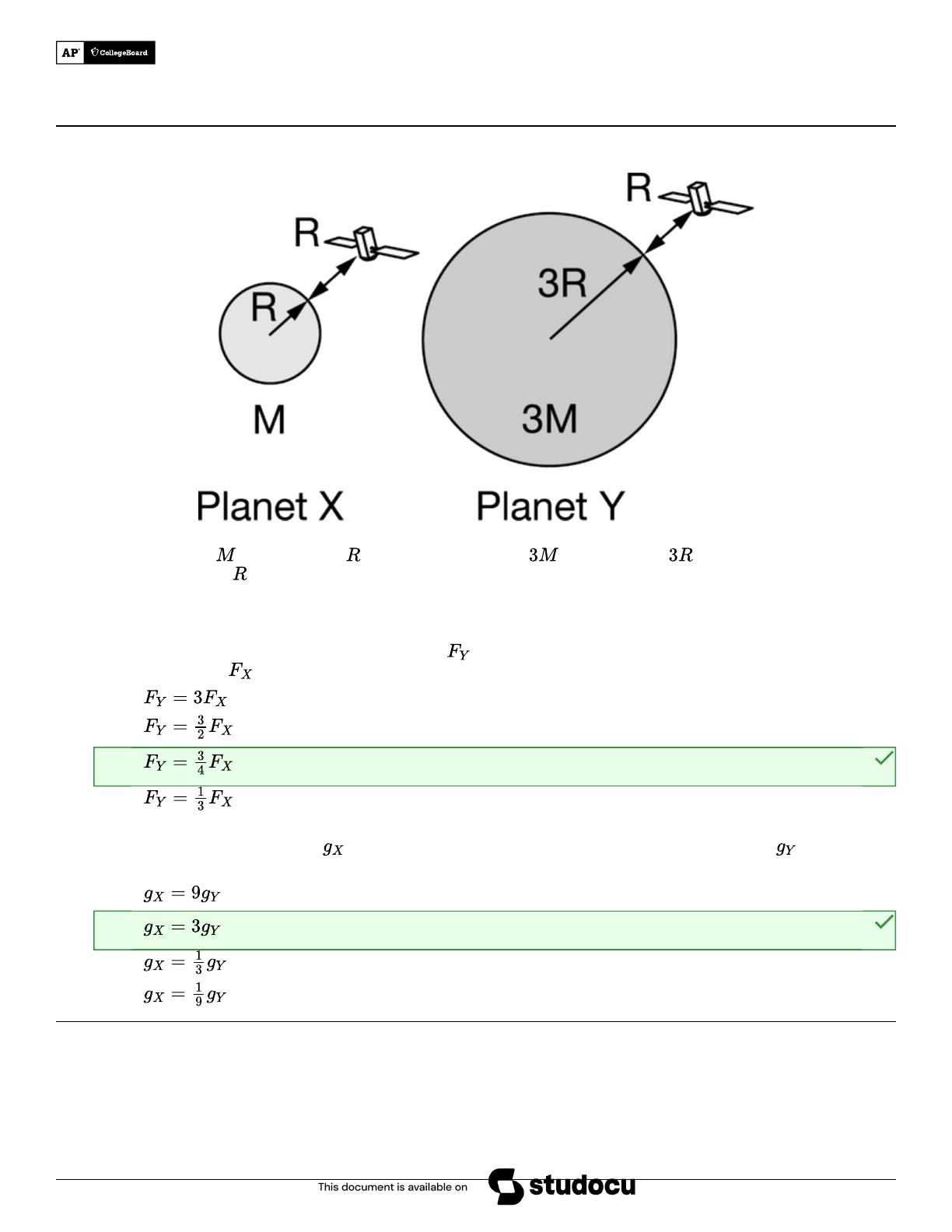 Unit 3 Progress Check: MCQ Part A Planet X has a mass of and a radius of . Planet Y has a mass of and a radius of . Identical satellites orbit both planets at a distance above their surfaces, as shown above. The planets are separated by such a large distance that the gravitational forces between them are negligible. 1. How does the magnitude of the gravitational force exerted by Planet Y on its satellite compare to the gravitational force exerted by Planet X on its satellite?