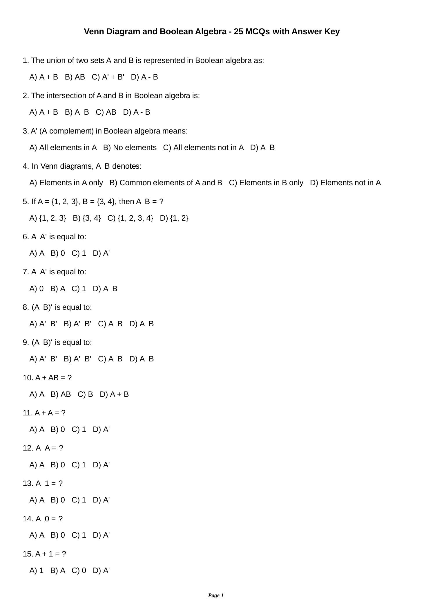 Venn Diagram and Boolean Algebra - 25 MCQs with Answer Key