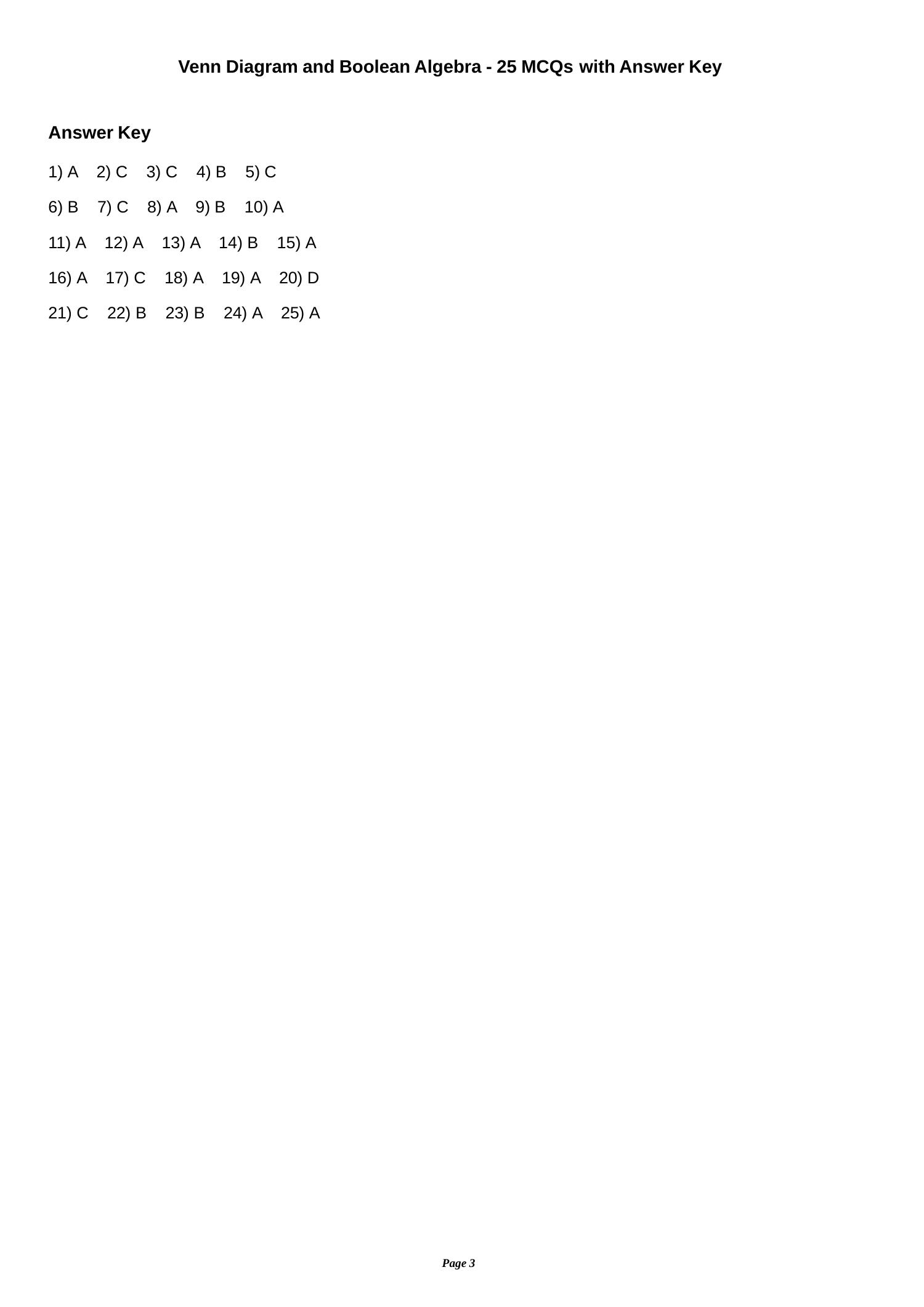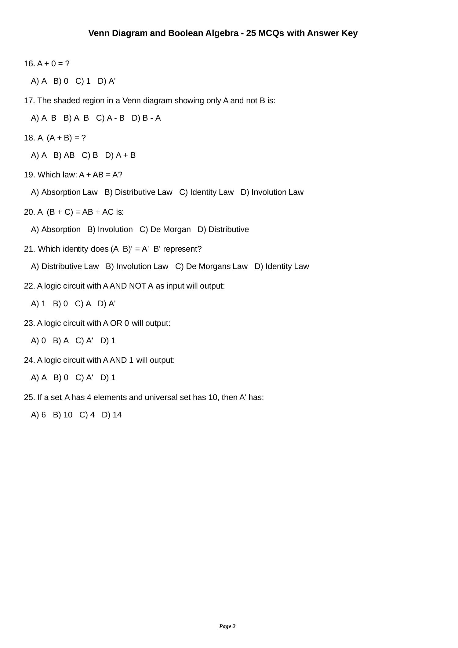 The document contains 25 multiple-choice questions (MCQs) focused on Venn diagrams and Boolean algebra, along with an answer key. Each question tests knowledge on set operations, Boolean expressions, and logic circuit outputs. The answer key provides the correct responses for each question.