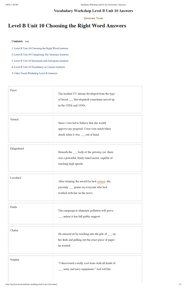 Vocabulary Workshop Level B Unit 10 Answers » Quizzma